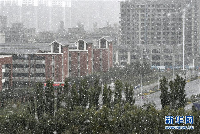 這是在銀川市街頭拍攝的雪景(10月14日攝)。當(dāng)日,寧夏銀川市迎來降雪天氣。寧夏氣象臺發(fā)布暴雪藍(lán)色預(yù)警,提醒市民注意交通安全、做好防寒、防滑和清雪工作。新華社記者王鵬攝