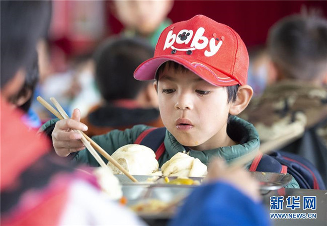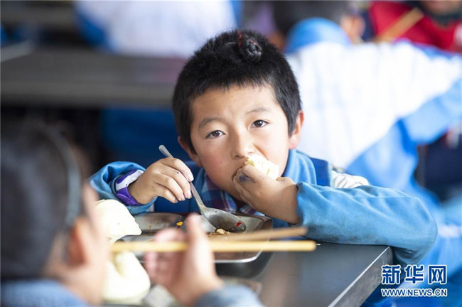 在西吉縣田坪鄉(xiāng)中心小學(xué),學(xué)生在享用免費(fèi)營(yíng)養(yǎng)午餐(10月23日攝)。