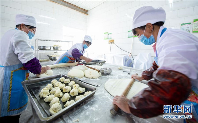 在西吉縣田坪鄉(xiāng)中心小學(xué),食堂的工作人員在制作午餐面點(diǎn)(10月23日攝)。