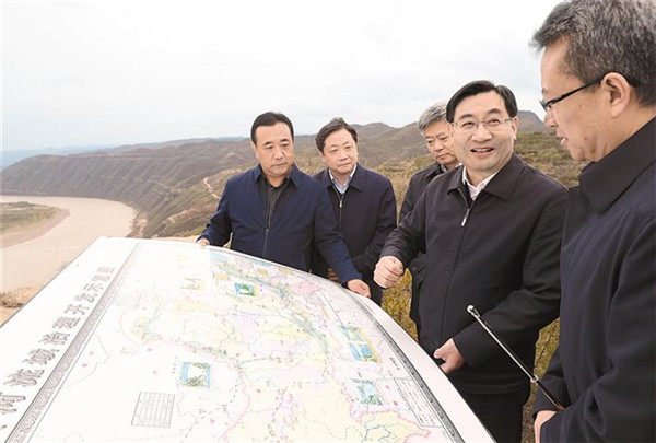 十月二十四日,省委書記胡和平來到位于宜川縣云巖鎮(zhèn)的黃河古賢水利樞紐工程現(xiàn)場,聽取項目規(guī)劃介紹。 本報記者 宋紅梅攝