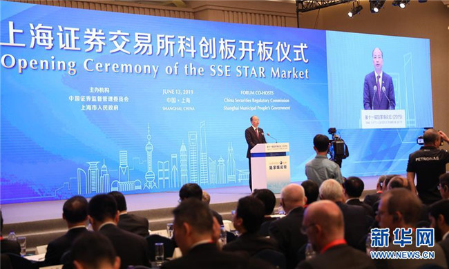 上海證券交易所科創(chuàng)板開板儀式在陸家嘴論壇上舉行。這是中國證監(jiān)會(huì)主席易會(huì)滿在開板儀式上致辭(6月13日攝)。新華社記者 方喆攝
