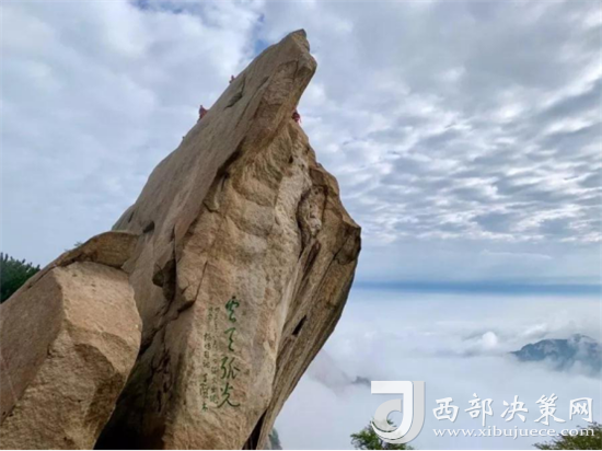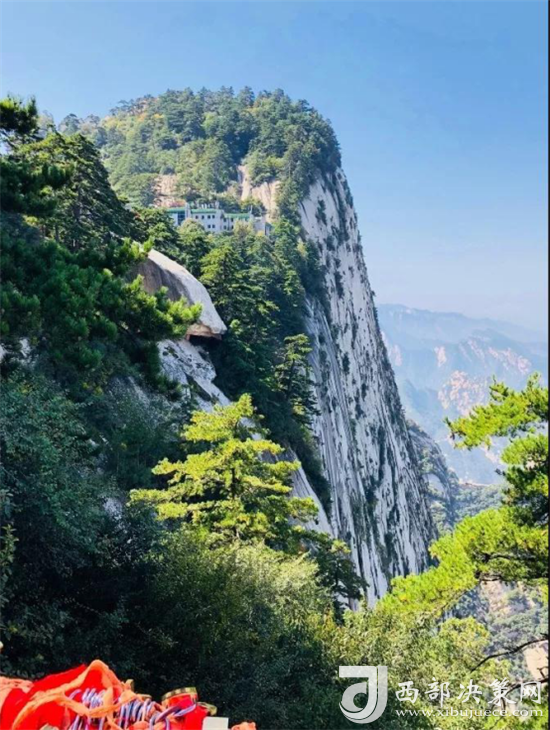 整個(gè)西峰為一塊渾然天成的巨石,北面臨空,懸崖絕壁如刀削鋸截,東西兩側(cè)狀如蓮花,因此也稱“蓮花峰”,這里更是“劈山救母”、“寶蓮燈”等傳說故事的發(fā)生地。