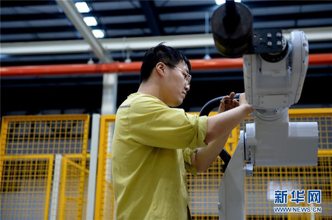 在蕪湖機器人產(chǎn)業(yè)園,工作人員在預(yù)裝埃夫特六關(guān)節(jié)機器人零部件(10月21日攝)。 新華社發(fā)(黃博涵攝)