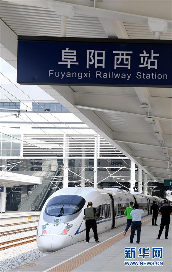 10月24日,一輛試運行列車停靠在商合杭高鐵阜陽西站。 新華社記者劉軍喜攝