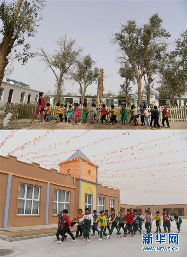 拼版照片:上圖為幼兒園學生走在易地扶貧搬遷前的于田縣達里雅布依鄉(xiāng)學校內(nèi)(2018年9月5日攝);下圖為幼兒園學生走在新校園內(nèi)(2019年3月20日攝)。
