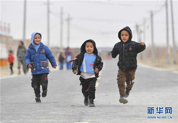 11月18日,幼兒園大班的小朋友放學后走在于田縣達里雅布依鄉(xiāng)易地扶貧搬遷安置點的硬化道路上。新華社記者胡虎虎攝