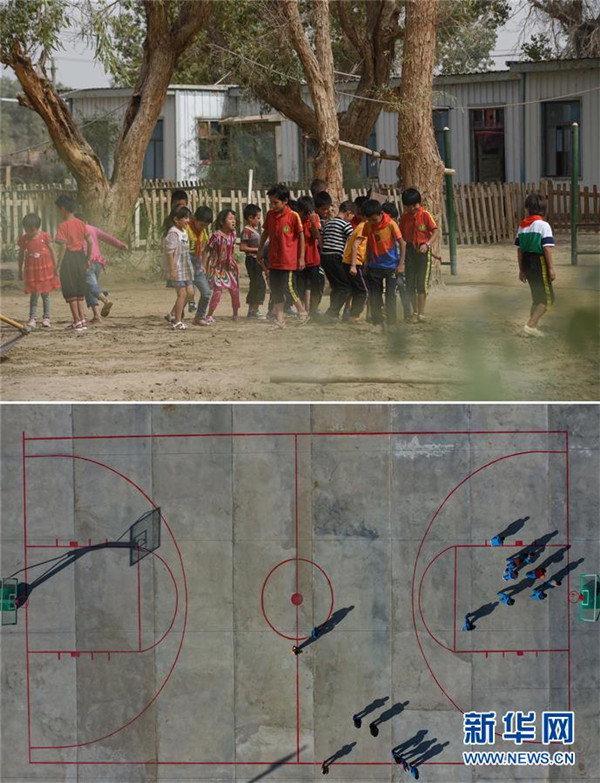 拼版照片:上圖為學生利用課間時間在平整易地扶貧搬遷前的校園操場(2018年9月6日攝);下圖為學生們在于田縣達里雅布依鄉(xiāng)易地扶貧搬遷安置點的水泥操場上打籃球(2019年11月19日無人機拍攝)。新華社記者胡虎虎攝