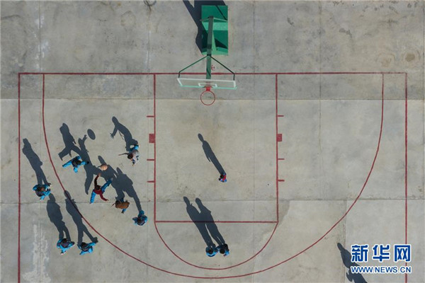 11月19日,在新疆于田縣達里雅布依鄉(xiāng)易地扶貧搬遷安置點的新學校,課間休息時,孩子們在水泥操場上打籃球。在該校位于塔克拉瑪干沙漠腹地的舊址,孩子們平時只能在沙土地上玩耍。新華社記者沈伯韓攝
