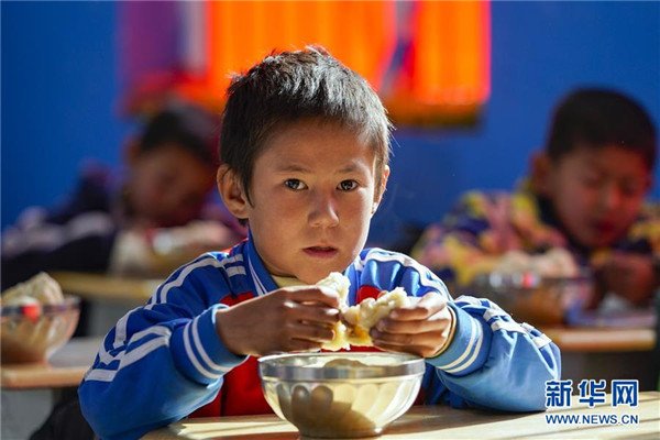 11月19日,在新疆于田縣達里雅布依鄉(xiāng)易地扶貧搬遷安置點的新學校,一年級學生在學校里吃免費午餐。新華社記者沈伯韓攝