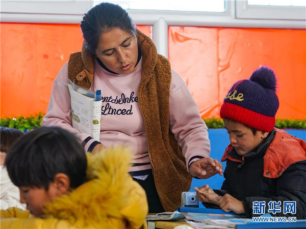 11月19日,在新疆于田縣達里雅布依鄉(xiāng)易地扶貧搬遷安置點的新學校,數(shù)學老師艾比拜木·吾布力艾山(中)在輔導一年級學生做計算題。新華社記者沈伯韓攝