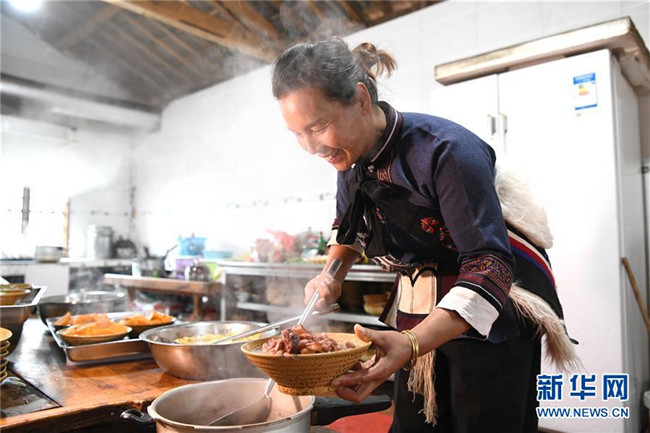11月28日,42歲的大糯黑村村民李學(xué)芝在廚房內(nèi)為游客準備午餐。李學(xué)芝和丈夫畢興學(xué)經(jīng)營著一家農(nóng)家樂,生意紅火。新華社記者周華攝