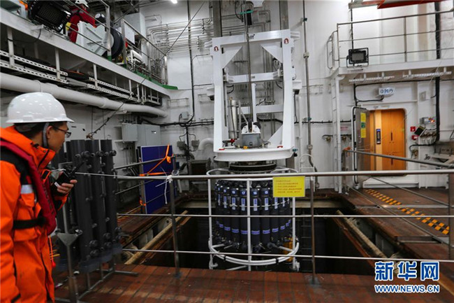 12月9日,科考隊員首次利用“雪龍2”號月池系統(tǒng)進(jìn)行CTD采水作業(yè)。 新華社記者 劉詩平 攝