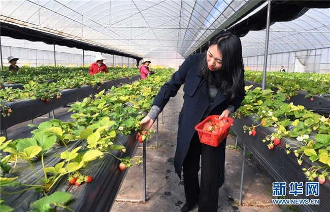 1月9日,游客在云南省富民縣散旦鎮(zhèn)漢營村草莓種植基地采摘。 新華社記者楊宗友攝
