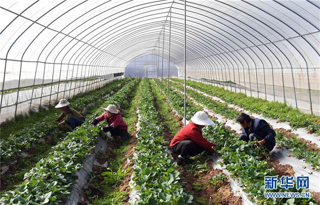 1月9日,云南省富民縣散旦鎮(zhèn)漢營村農(nóng)民在草莓種植基地除草。 新華社記者楊宗友攝