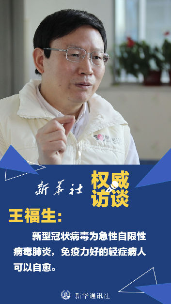 王福生:給大家普及一個(gè)概念,新型冠狀病毒肺炎它本身是一種急性自限性的疾病。什么叫自限性的呢?有的輕癥病人,他不經(jīng)過治療可以自己好,其它重癥病例通過治療才能恢復(fù)。這個(gè)過程中間,他有一種叫自己好的“自愈”,所以說我覺得“自愈”加上“治愈”,如果他癥狀輕,肺部的病變不嚴(yán)重,免疫力又比較好,這樣通過自身抗病毒的能力,就很快地把病毒控制了,但這可能得有3周左右。