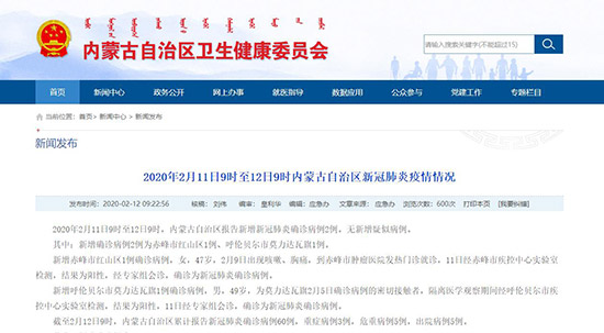 2月12日,記者從內(nèi)蒙古自治區(qū)衛(wèi)生健康委員會獲悉,2020年2月11日9時至12日9時,內(nèi)蒙古自治區(qū)報告新增新冠肺炎確診病例2例。無新增疑似病例。