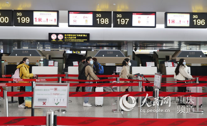 隨著旅客返程復(fù)工增多,重慶機(jī)場(chǎng)為最大限度減少人員聚集,通過(guò)自助值機(jī)、無(wú)紙化值機(jī)縮短旅客在候機(jī)樓停留時(shí)間同時(shí),引導(dǎo)旅客在值機(jī)、安檢、登機(jī)排隊(duì)時(shí),都保持1米以上的安全防護(hù)距離。