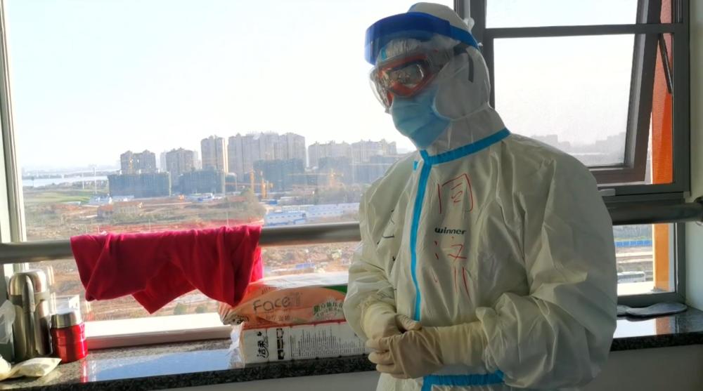圖為遼寧援助武漢雷神山醫(yī)療隊(duì)隊(duì)員張倩在隔離病房外等待隊(duì)友。