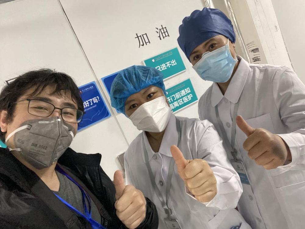 圖為新華社記者許楊與醫(yī)護(hù)人員合影。