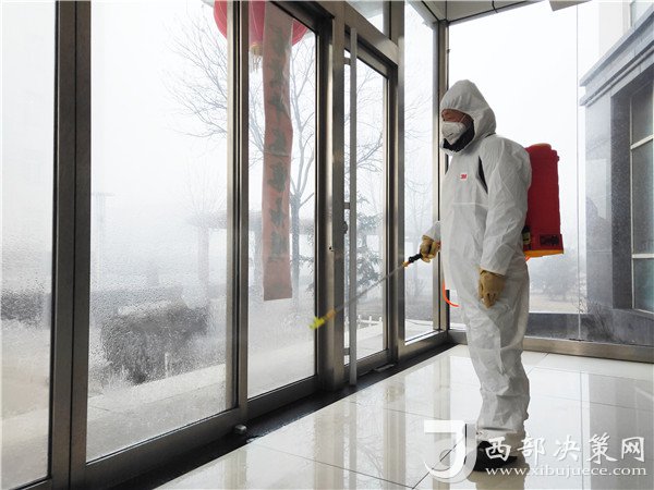 消毒員武存照在辦公樓消毒
