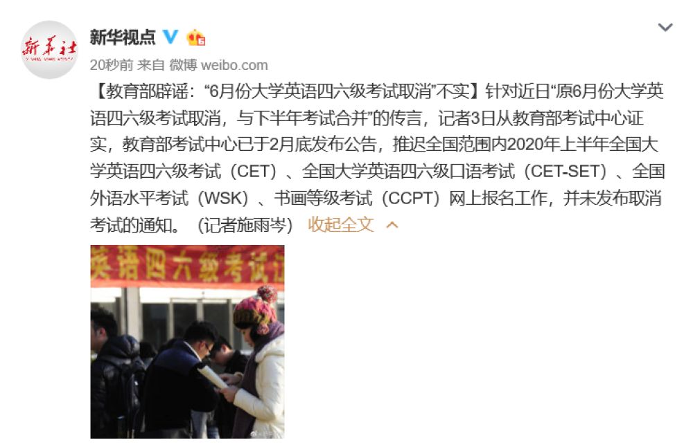 針對近日“原6月份大學英語四六級考試取消,與下半年考試合并”的傳言,記者3日從教育部考試中心證實,教育部考試中心已于2月底發(fā)布公告,推遲全國范圍內(nèi)2020年上半年全國大學英語四六級考試(CET)、全國大學英語四六級口語考試(CET-SET)、全國外語水平考試(WSK)、書畫等級考試(CCPT)網(wǎng)上報名工作,并未發(fā)布取消考試的通知。
