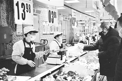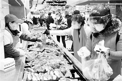 近來,各地采取多種措施,在疫情防控期間保障豬肉市場供應(yīng),滿足居民消費需求。圖為市民在河南省鄭州市一家大型超市內(nèi)采購豬肉。新華社記者 馮大鵬攝