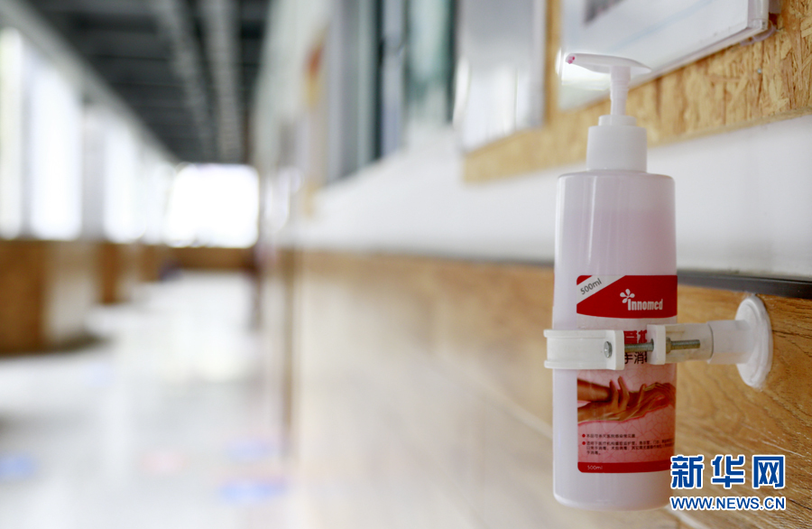 在教室、走廊、寢室等人流密集的場合,重慶市第十一中學配備了免洗消毒液供師生使用。新華網 彭博攝
