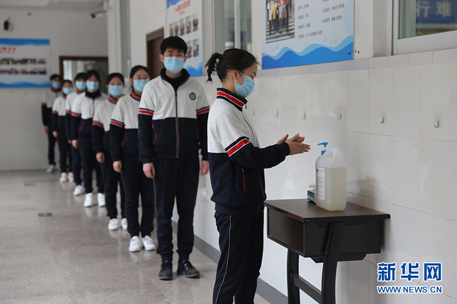 在西南大學附屬中學,上課前學生需提前洗手,在教室外間隔1米左右排隊等待班主任檢查后進入教室上課。班主任將戴好一次性醫(yī)用口罩和一次性手套逐一對學生進行體溫檢查,并做好檢查登記。圖為學生演習進教室環(huán)節(jié)。新華網發(fā)