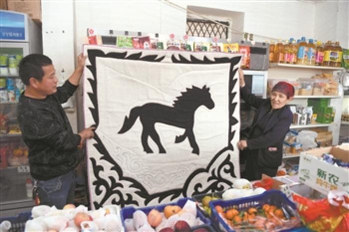 4月14日,在新疆托里縣多拉特鄉(xiāng)加瑪特村電子商務(wù)服務(wù)點(diǎn)負(fù)責(zé)人劉志江(左)與貧困戶馬合甫扎·阿勒木賽依提一起展示銷售的產(chǎn)品。 新華社記者 沙達(dá)提 攝
