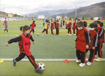 4月27日,在四川省涼山彝族自治州普格縣螺髻山鐵道兵希望學校的操場上,小球員在老師的指導下踢球。瀘州市龍馬潭區(qū)對口幫扶普格縣前方指揮部于2019年3月探索體育扶貧,在螺髻山鐵道兵希望學校組建了足球隊,從幫扶干部中選派體育教師,利用業(yè)余時間指導球隊訓練。男隊去年參加了涼山州青少年校園足球聯(lián)賽,并打進了男子組八強。王明峰 何海洋攝影報道