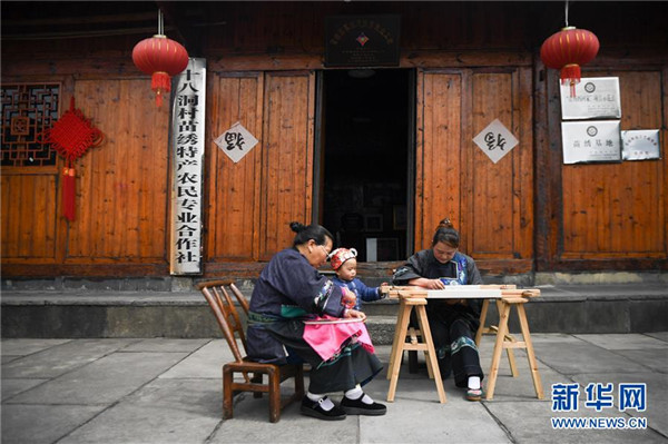 吳美金(右)在十八洞村苗繡特產(chǎn)農(nóng)民專業(yè)合作社繡苗繡(4月24日攝)。1967年出生的吳美金,1992年嫁入飛蟲村(現(xiàn)十八洞村飛蟲寨)時,只有爛泥路的飛蟲村不僅田土少,掙錢活路也少,生活十分困難。2014年,吳美金加入了十八洞村苗繡特產(chǎn)農(nóng)民專業(yè)合作社,從小就會的苗繡傳統(tǒng)手藝如今成了家庭增收的法寶,不僅在家門口就把錢掙了,同時還能照顧年幼的孫子孫女。“現(xiàn)在的日子,比年輕的時候好多了。”吳美金說。新華社記者薛宇舸攝