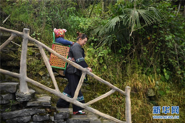 吳美金背著孫子走在十八洞村中,準(zhǔn)備前往村里的苗繡合作社(4月24日攝)。1967年出生的吳美金,1992年嫁入飛蟲村(現(xiàn)十八洞村飛蟲寨)時,只有爛泥路的飛蟲村不僅田土少,掙錢活路也少,生活十分困難。2014年,吳美金加入了十八洞村苗繡特產(chǎn)農(nóng)民專業(yè)合作社,從小就會的苗繡傳統(tǒng)手藝如今成了家庭增收的法寶,不僅在家門口就把錢掙了,同時還能照顧年幼的孫子孫女。“現(xiàn)在的日子,比年輕的時候好多了。”吳美金說。新華社記者薛宇舸攝