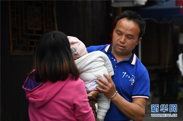 施六金(右)從妻子手中接過兒子施澤恩(4月25日攝)。1973年出生于十八洞村的施六金,由于父親患病很早就放棄學(xué)業(yè)和母親扛起了家庭的重?fù)?dān)。為了生活,他還曾遠(yuǎn)去東南亞打工。2015年,看到家鄉(xiāng)的變化,施六金回到村里開起了農(nóng)家樂,年度家庭人均純收入也從2014年的1715元增長到了2019年的35696元。2018年,施六金與心愛的人組建了家庭。今年初,施六金與愛人迎來了一個大胖小子。“做人做事要懂得回報和感恩。”施六金給剛出生的兒子取名施澤恩。新華社記者薛宇舸攝