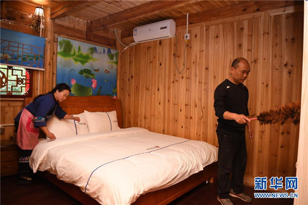 楊正邦(右)和妻子施蘭珍一起打掃民宿房間(4月25日攝)。楊正邦1978年出生于十八洞村,在外打工多年。近些年,眼看來十八洞村的游客越來越多,村里越來越熱鬧,楊正邦在2017年結(jié)束自己的打工生涯回鄉(xiāng)發(fā)展。他先是在村里擺起小吃攤,2018年開起農(nóng)家樂,去年又搭起新房子擴建成民宿,年度家庭人均純收入從2014年的1923元增加到2019年的7173元。新華社記者薛宇舸攝