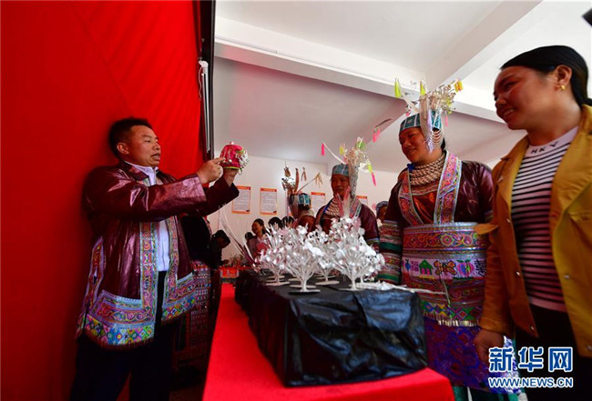 5月12日,在廣西融水苗族自治縣同練瑤族鄉(xiāng)民族廣場,侗族群眾在展示侗族頭飾。新華社記者 黃孝邦 攝