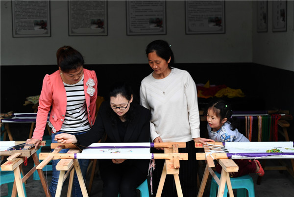 5月14日,李紹玉(左二)在位于重慶彭水縣高谷鎮(zhèn)共和村的非遺扶貧工坊演示手工刺繡。新華社記者王全超攝