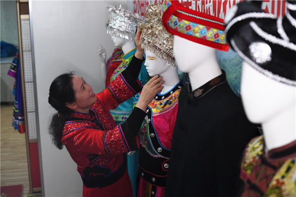 5月13日,李紹玉在重慶彭水榮玉苗繡工坊整理苗族服裝和頭飾。新華社記者王全超攝