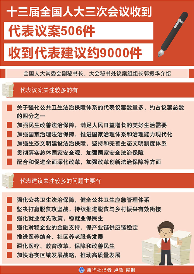 記者26日從十三屆全國(guó)人大三次會(huì)議秘書處獲悉,到大會(huì)主席團(tuán)決定的代表提出議案截止時(shí)間5月25日12時(shí),大會(huì)秘書處共收到代表提出的議案506件。同時(shí),收到代表建議約9000件。