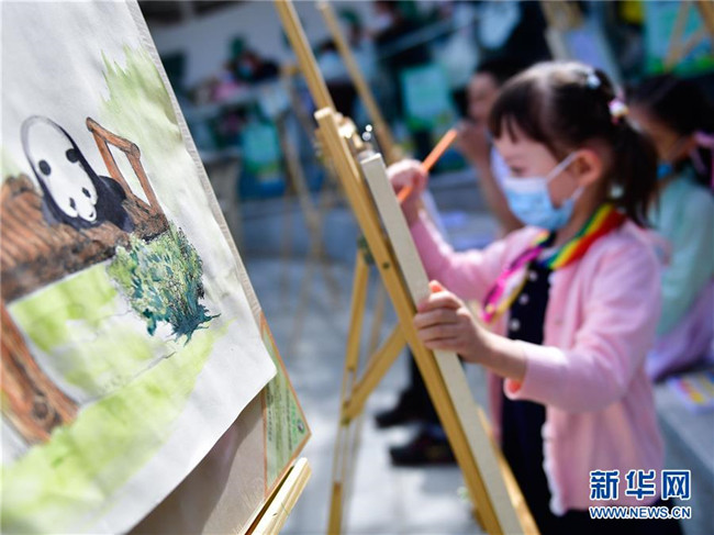 5月31日,小朋友在西寧熊貓館內繪畫。 新華社記者 張龍 攝