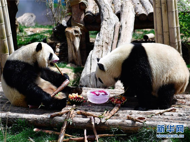 5月31日,兩只大熊貓在享用兒童節(jié)“大餐”。 新華社記者 張龍 攝