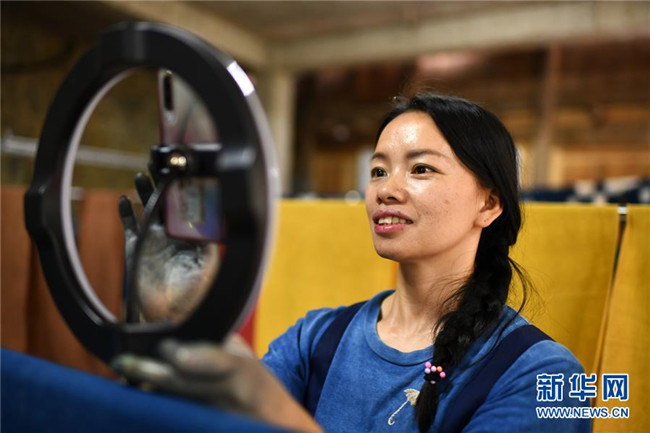 楊成蘭在用手機(jī)對(duì)侗族土布植物染色技藝進(jìn)行網(wǎng)絡(luò)直播(5月28日攝)。新華社記者 楊文斌 攝