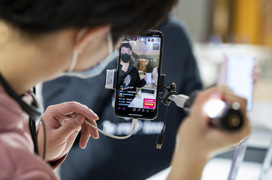 在鄭州市一家商場,售貨員利用網絡直播平臺介紹手機商品。新華社供圖