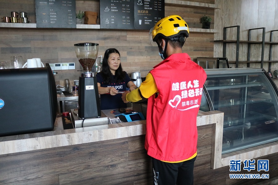 “您好,我是重慶市快遞、外賣騎手禁毒宣傳志愿者,您點(diǎn)的外賣到了。”配送時,周歡把外賣和禁毒宣傳品一同遞交給了顧客,并向她介紹了禁毒知識。新華網(wǎng)發(fā) (滕華 攝)