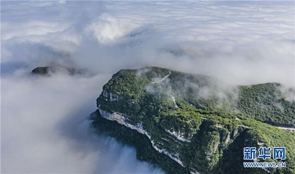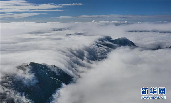 6月10日拍攝的漢中市南鄭區(qū)龍頭山主峰云海景觀(無人機(jī)照片)。雨后初霽,川陜交界的陜西省漢中市南鄭區(qū)龍頭山旅游景區(qū)云海涌動(dòng),風(fēng)光迷人。新華社記者陶明攝