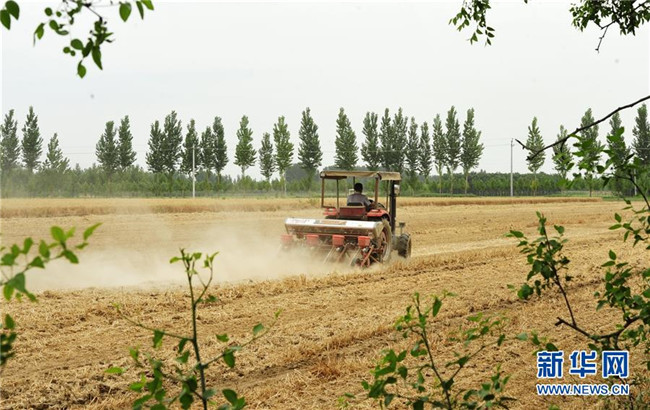 時(shí)下,河北省各地農(nóng)民抓住有利時(shí)機(jī),在搶收小麥的同時(shí)播種玉米,確保不誤農(nóng)時(shí)。