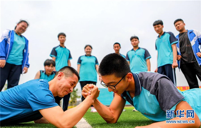 6月22日,河北省邯鄲市邯山區(qū)第一中學(xué)的高三學(xué)生和老師進(jìn)行“掰手腕”游戲。 新華社記者 王曉 攝