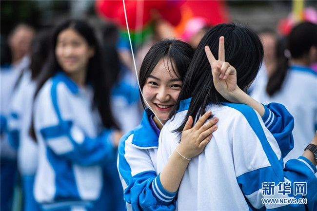 6月27日,烏當中學高三學生在畢業(yè)典禮上和同學擁抱。 新華社記者 陶亮 攝