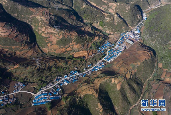 俯瞰群山中的四川省布拖縣烏科鄉(xiāng)洛呷村集中安置點(diǎn)(5月17日攝,無人機(jī)照片)。新華社記者江宏景攝