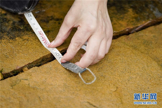 7月1日,地質(zhì)災(zāi)害監(jiān)測員侯芳在古家坳不穩(wěn)定斜坡地質(zhì)災(zāi)害點(diǎn)的一條裂縫前進(jìn)行測量工作。新華社記者 劉潺 攝