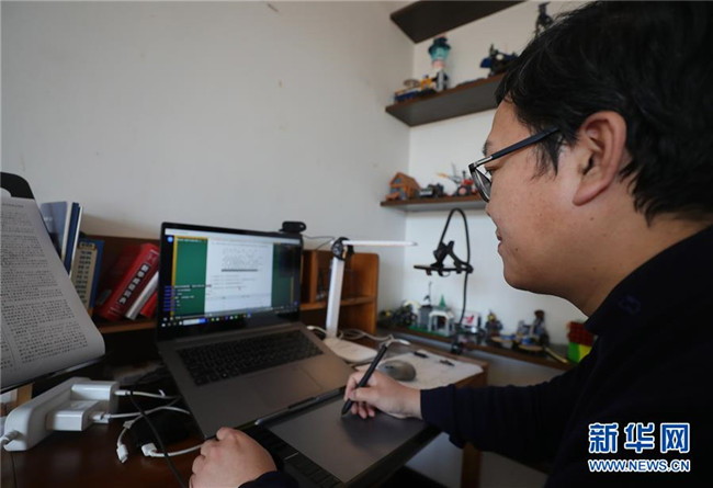 遼寧省沈陽市蘇家屯區(qū)青松中學杜波老師在家中通過網絡平臺給同學們上化學課(3月11日攝)。新華社記者 楊青 攝
